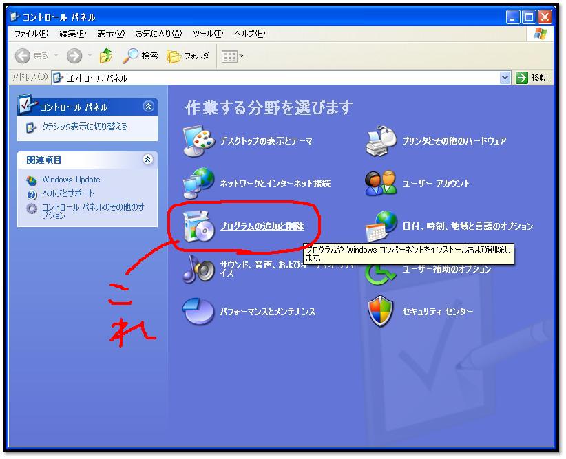 ②「作業する分野を選びます」の画面で「プログラムの追加と削除」を選択してください。