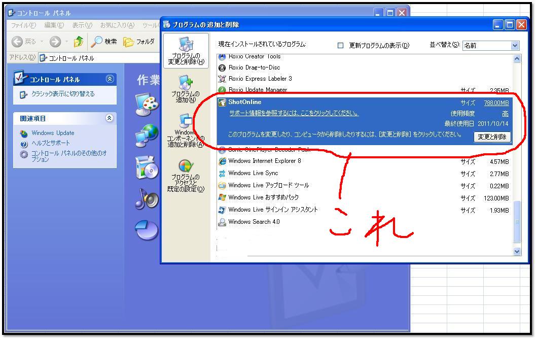 ③「プログラムの追加と削除」の画面にプログラムのリストが表示されるので「ShotOnline」を選択してください。